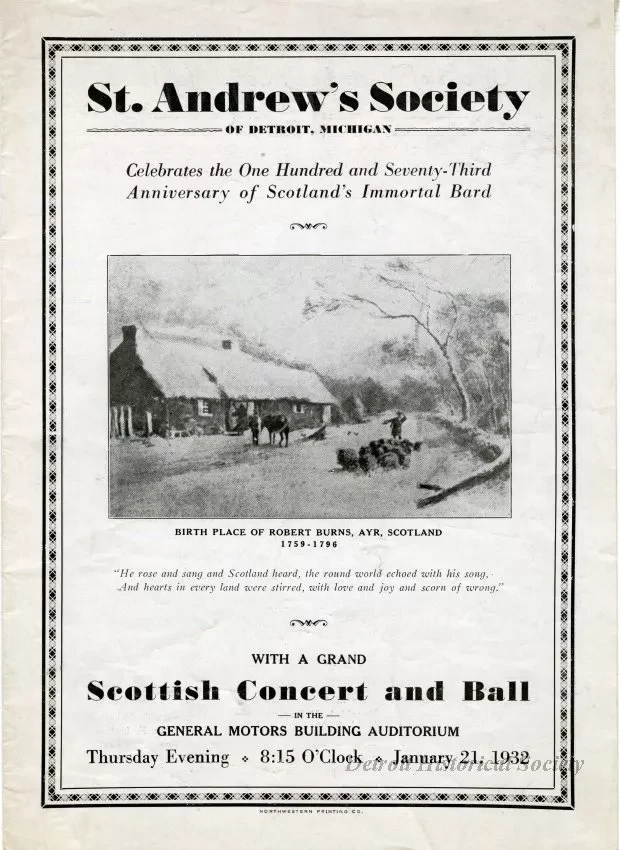 12 page souvenir program for the Grand Scottish Concert and Ball held by the St. Andrew's Society of Detroit at the General Motors Building auditorium on January 21, 1932 in celebration of the 173rd anniversary of the birth of Robert Burns, whose birth place is pictured on the cover. The program for the night is printed in a narrow column at the center of each page, surrounded by advertisements, many geared toward people of Scottish heritage such as trips to Scotland, and Scottish food.