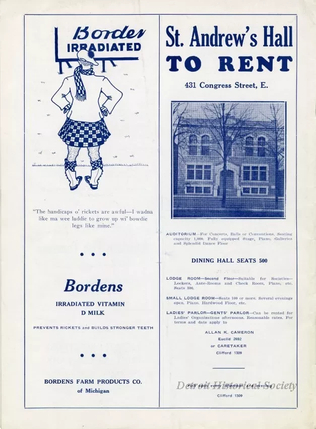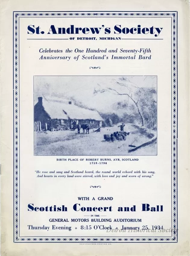 16 page souvenir program for the Grand Scottish Concert and Ball held by the St. Andrew's Society of Detroit at the General Motors Building auditorium on January 25, 1934 in celebration of the 175th anniversary of the birth of Robert Burns, whose birth place is pictured on the cover. The program for the night is printed in a narrow column at the center of each page, surrounded by advertisements, many geared toward people of Scottish heritage such as trips to Scotland, Scottish food, and an advertisement for Bordens irradiated milk featuring a cartoon of a man in a kilt with rickets on the back cover.