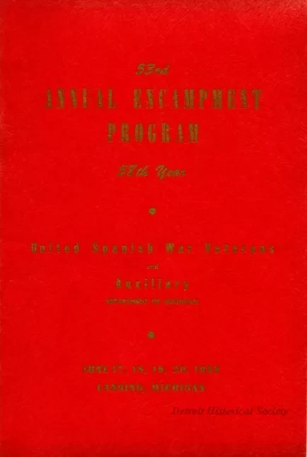 One program for the "53rd Annual Encampment Program, United Spanish War Veterans and Auxiliary, Department of Michigan." The encampment took place in Lansing, Michigan, on June 17-20, 1956. The program is printed in a softcover booklet format which contains 18 pages of printed text on white paper. The program shows the schedule of events, names of various department officers, and several black and white photographic images of department officers.