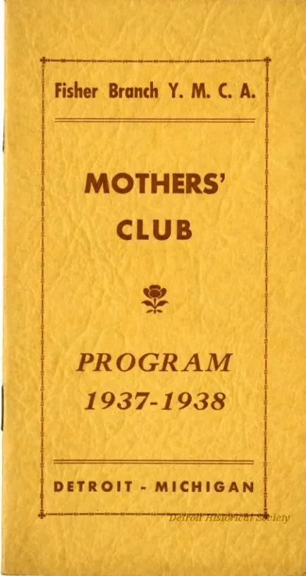 1937-1938 meeting program for the Mothers' Club of the Fisher Branch of the Y.M.C.A. Within the tan cover are a list of club activities, a calendar of meetings, a list of board members and past presidents, and a poem entitled, "A Collect for Club Women."