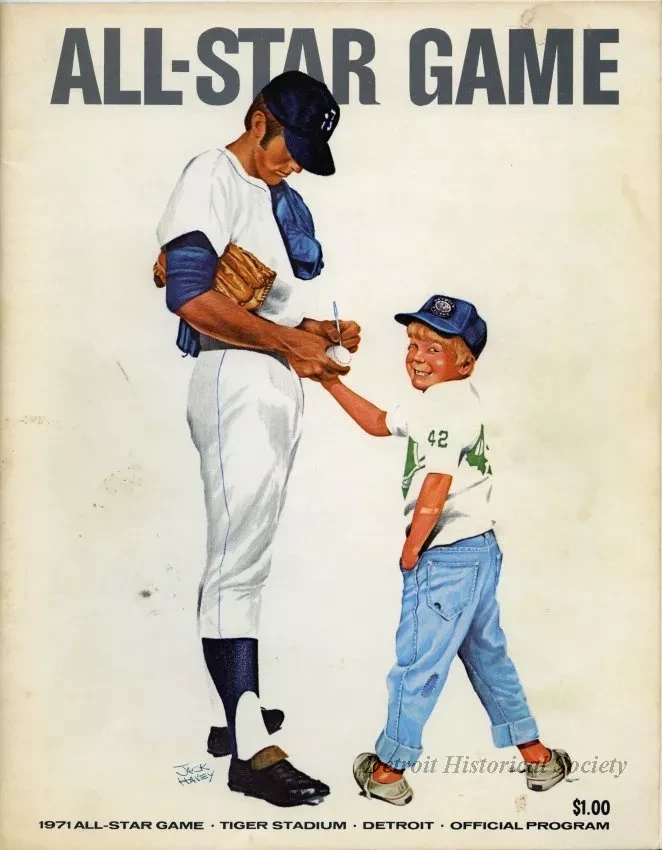 Program for the 1971 All-Star Game held at Detroit Stadium, July 13, 1971. The front over features an illustration by Jack Havey of a boy getting a baseball autographed by a player. The game included Detroit Tigers Al Kaline, Norm Cash, Bill Freehan, and Mickey Lolich.