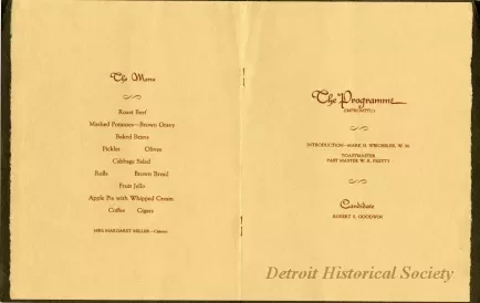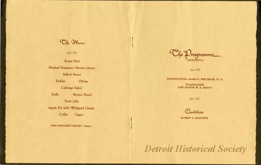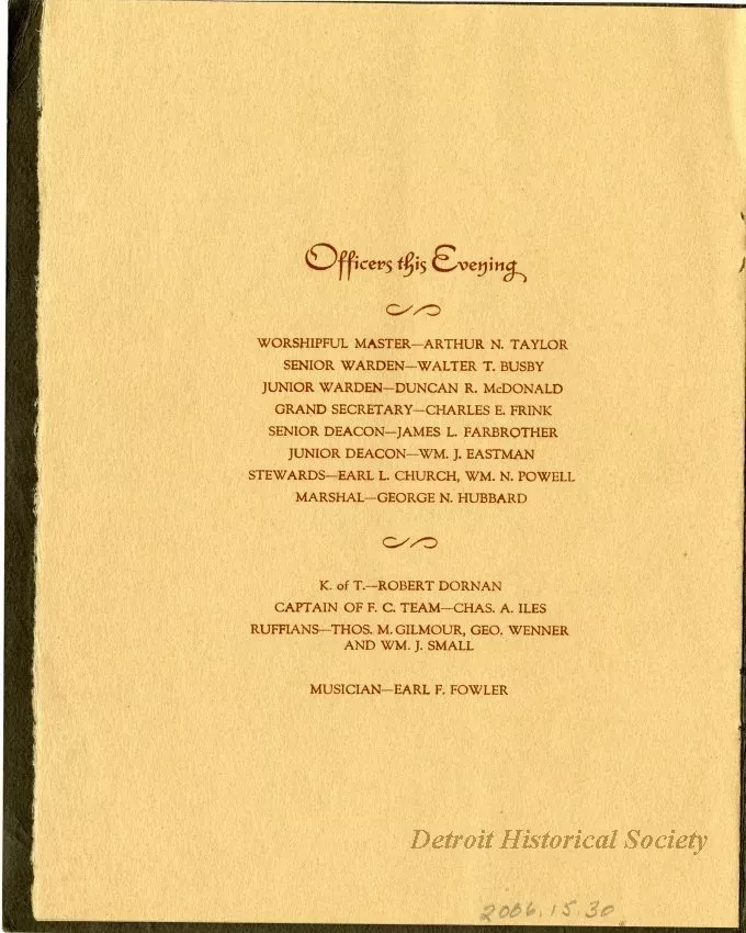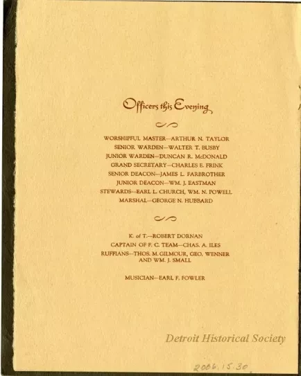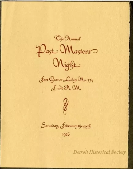 Program from the Annual Past Masters Night of Fort Gratiot Lodge No. 374 of the Free and Accepted Masons held on Saturday February 6, 1926. The program is bound in a black cardstock cover with an embossed leather design and a red compass and square Masonic symbol. Within are found tan pages bearing the menu, the brief schedule for the ceremony, and a list of officers.