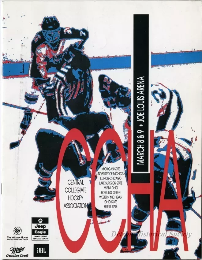 One program for the "Central Collegiate Hockey Association, CCHA" championship tournament on March 8-9, 1991, at Joe Louis Arena. The softcover program has a multicolor image of hockey players on the front. It contains 16 pages that are printed in black text on white paper and gives a roster of player names for each college team. Black and white photographic images are also included along with tournament statistics. Many color advertisements are shown throughout the program.