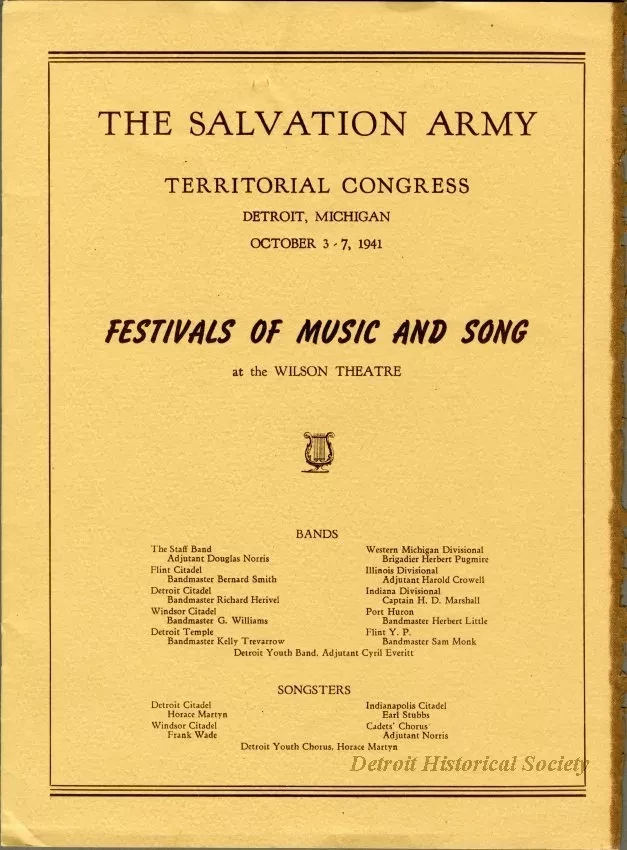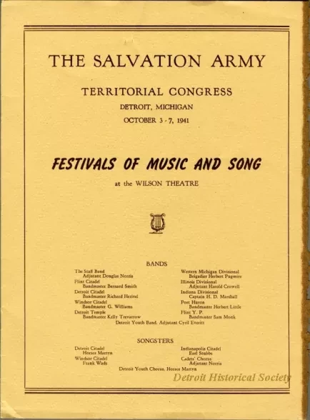 Staple-bound program booklet for the "Festivals of Music and Song," held at the Wilson Theatre, during the Salvation Army Territorial Congress in Detroit from October 3rd to the 7th, 1941.
