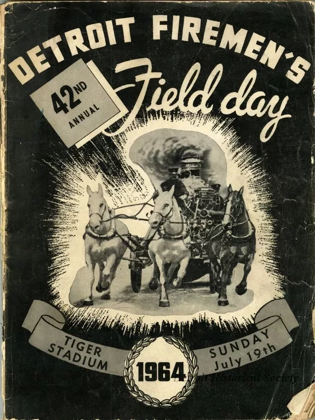 Program book for the 1964 Detroit Firemen's Fund Association Field Day held at Tiger Stadium on July 19th. A half-tone photo of a team of three horses pulling a fire engine against a black background is on the cover. Articles on the Detroit Fire Department Medical Division, the Training Division, fire safety, civil defense in the wake of the Cuban Missile Crisis, and arson, as well as photos of Fire Department officials and recent fires, score cards for the event's baseball games, and numerous advertisements are contained within.