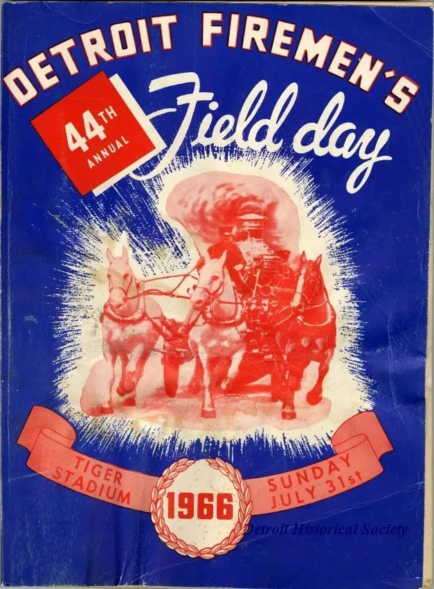 Program book for the 1966 Detroit Firemen's Fund Association Field Day held at Tiger Stadium on July 31st. A half-tone photo of a team of three horses pulling a fire engine against a red background is on the cover. Articles on the Firemen's Fund, the Fire Marshall Division, the Training Academy, the Public Relations Section, the Medical Division, the Apparatus Division, dispatcher and life-long fire department enthusiast Marvin Niefert, civil defense, the clowns of the Firemen's Thrill Show, as well as photos of Fire Department officials and recent fires, score cards for the event's baseball games, and numerous advertisements are contained within.