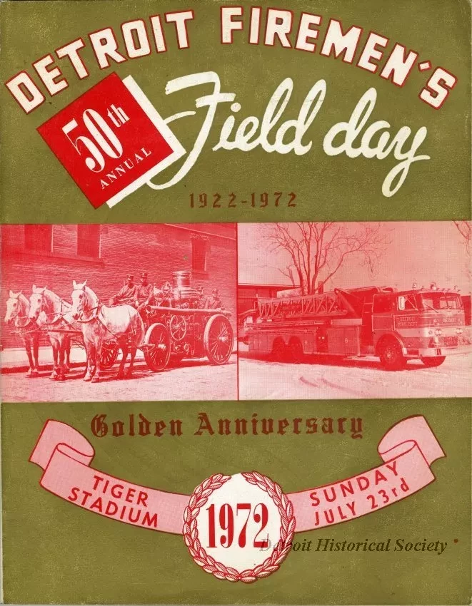 Program book for the 1972 Detroit Firemen's Fund Association Field Day held at Tiger Stadium on July 23rd. Side-by-side half-tone photos of a horse-drawn fire engine, and a modern fire truck are on the cover, surrounded by a gold background. Articles on the Medical Division, the Officers Club, the new Emergency Medical Service, the history of Detroit's fire boats (written by Clarence Woodard), the Detroit Fire Academy, and the role of the Detroit Fire Department's Communications Division during the 1967 Riot, as well as several photos of fires and numerous advertisements, are contained within.