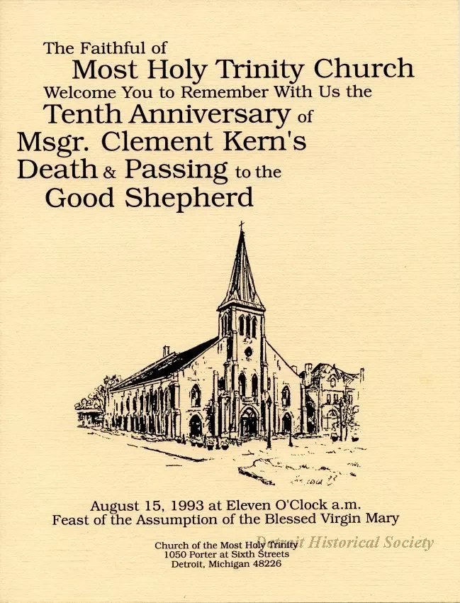 One program for a remembrance celebration of the life of Msgr. Clement Kern that was held at Most Holy Trinity Church on the Feast of the Assumption of the Blessed Mary on August 15, 1993. The booklet-style program has a tan heavyweight paper cover that is printed with black title text and shows a drawing that depicts a front corner view of the church. It contains 10 pages of black printed text on white paper with articles that offer memories of and tributes to the late longtime pastor, Msgr. Kern. Several black and white photographic images are included with the text.