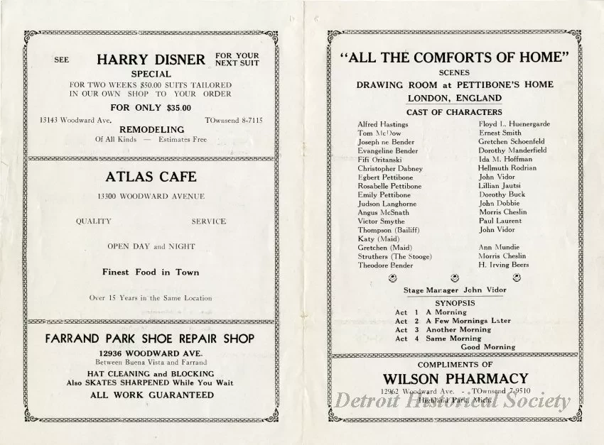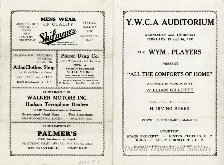 Half-folded program for a production of "All the Comforts of Home" at the Highland Park Y.W.C.A. Auditorium, presented by the WYM Players on February 13th and 14th, 1935. The cast are listed within along with advertisements for Harry Disner, the Atlas Cafe, the Farrand Park Shoe Repair Shop, Wilson Pharmacy, Shifman's, the Atlas Clothes Shop, the Plucer Drug Company, Walker Motors Incorporated, and Palmer's.