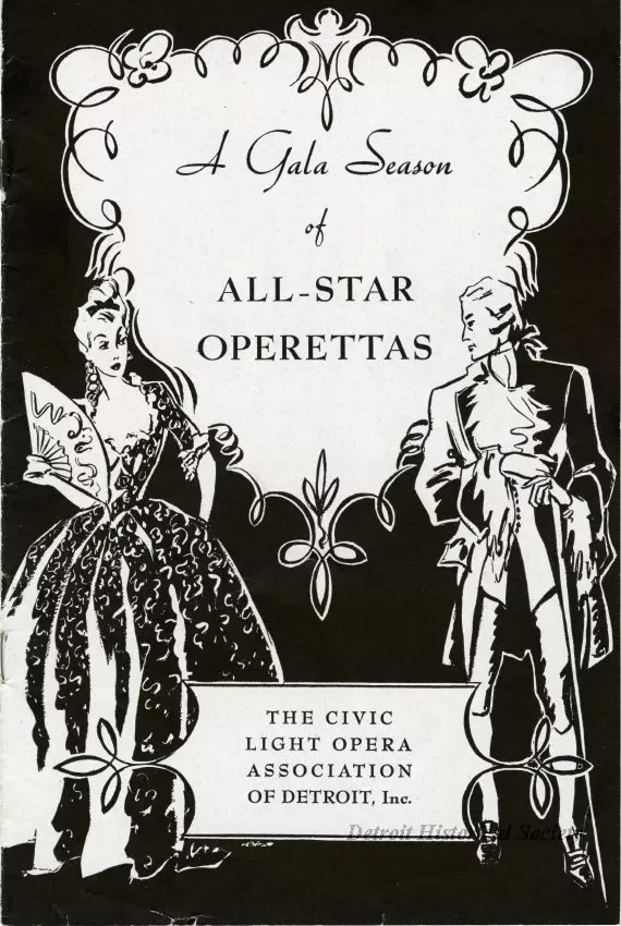 Program booklet for performances of "Hit the Deck" presented by the Civic Light Opera Association of Detroit at the Masonic Temple Auditorium during the eighth week of their 1944 season spanning February 29th to March 6th; front cover features a black and white illustration of a man and a woman dressed in 18th century costume; man has a walking stick and is looking at the woman, woman has a fan and is looking at the man; stand on either side of decorative text "A Gala Season of All-Star Operettas"; at bottom "The Civic Light Opera Association of Detroit, Inc." Information about the performance and advertisements are contained within.