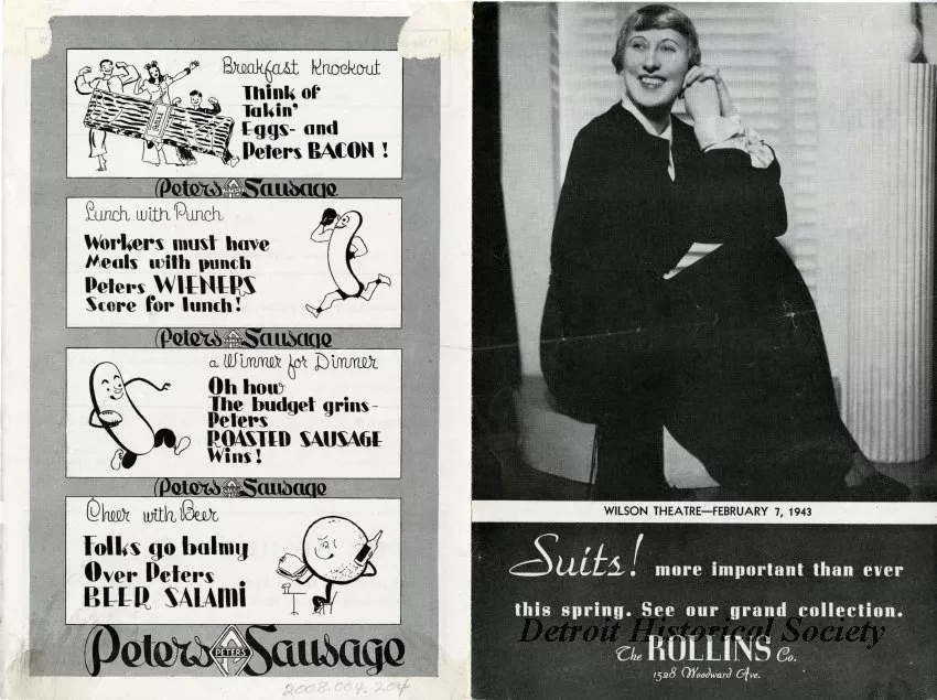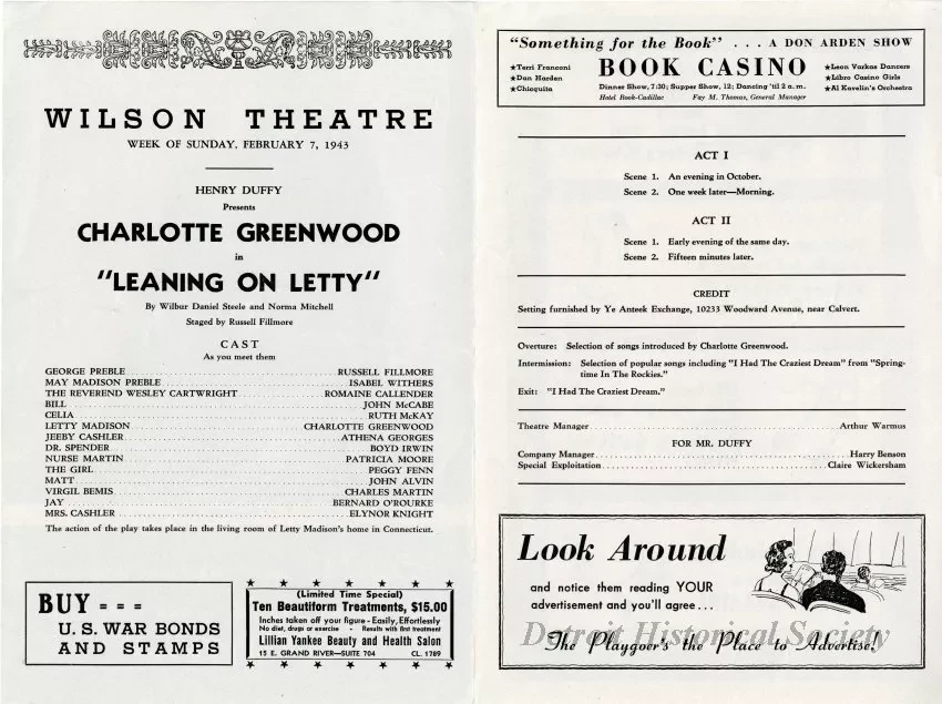 Half folded program for a production of "Leaning on Lefty," featuring Charlotte Greenwood at the Wilson Theatre, February 7, 1943. Program is printed in black and white with a photo of Charlotte Greenwood on cover. Cast, program and advertisments inside.