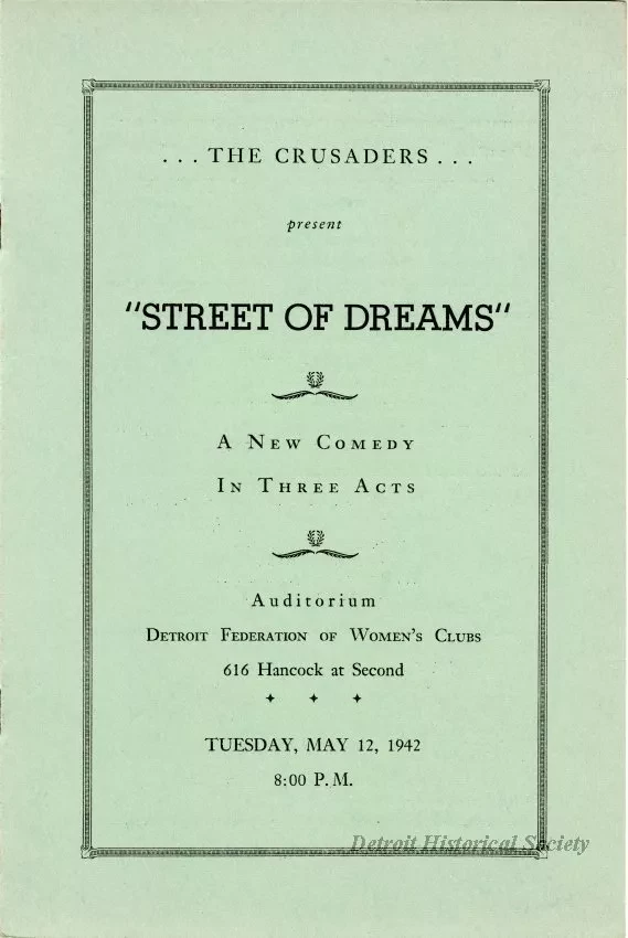 Program booklet for a production of "Street of Dreams," presented by The Crusaders at the Detroit Federation of Women's Clubs Auditorium, on May 12, 1945; cover: green with black text; information on the cast, scenes, and advertisements contained within.