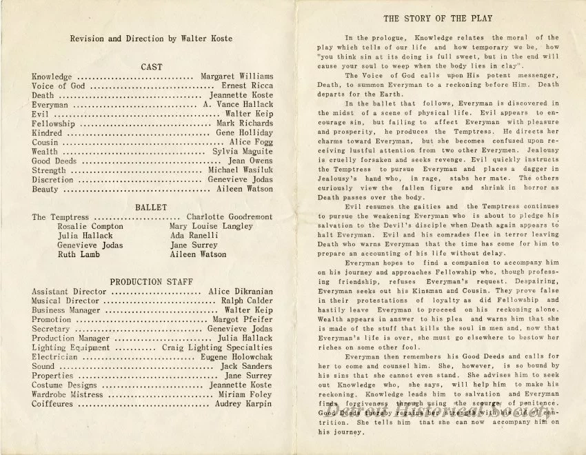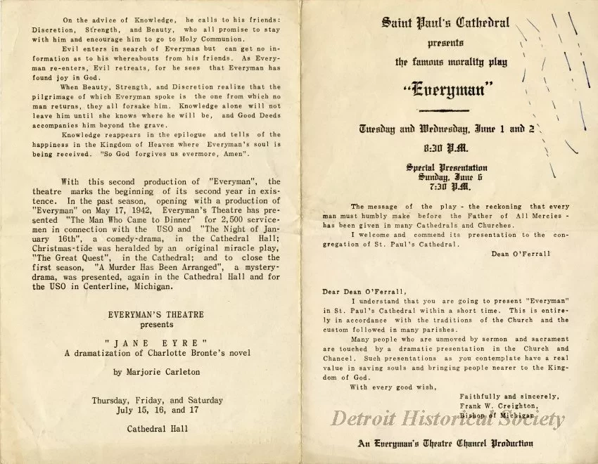 Half folded program for a production of the medieval morality play "Everyman," at St. Paul's Cathedral hall, performed by the church's Everyman Theatre troupe on June 1st, 2nd, and 6th, 1943. The program contains a messages from Dean Kirk Bassett O'Ferrall, and Bishop Frank W. Creighton, lists of cast and crew members, a summary of the play, information on the group's previous inaugural season, and on their upcoming adaptation of "Jane Eyre."