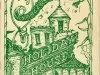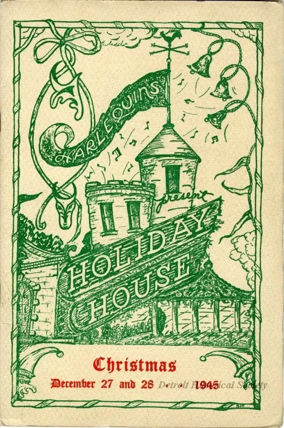 Program booklet for a production of Holiday House by the Harlequins as part of a Christmas celebration on December 27th and 28th of 1945 at Christ the King Catholic Church. The program contains song lyrics, roles for play about a visit by Santa Claus to Christ the King School, lists of patrons, committee and board members, jokes, poems, and numerous advertisements from sponsors primarily based in Redford. The program is staple-bound in a cover with a green illustration of a pair of towers and the title on the front.