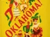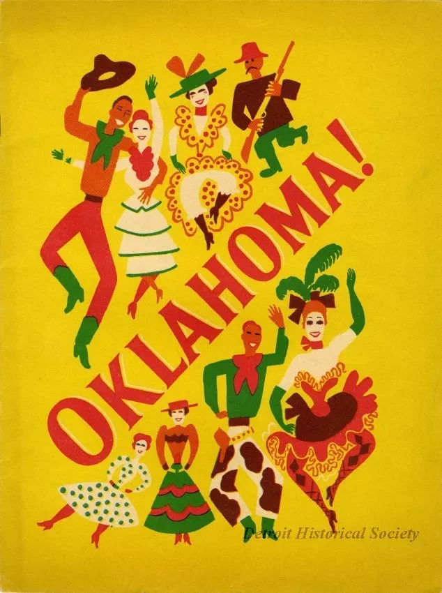 Souvenir program booklet for a production of "Oklahoma!," starring Robert Austin and Patricia Marnard. The booklet is bound in a yellow cover with illustrations of characters from the play dancing. Biographies of the cast and crew, black and white images from the production, and information on newer Rodgers and Hammerstein musicals are contained within.