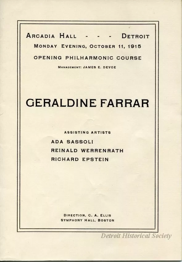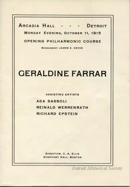 Program booklet for a performance by Geraldine Farrar at Arcadia Hall on October 11, 1915; includes program and lyrics to songs as well as translations; loose insert addressed "to our Patrons" regarding tickets, and car traffic.
