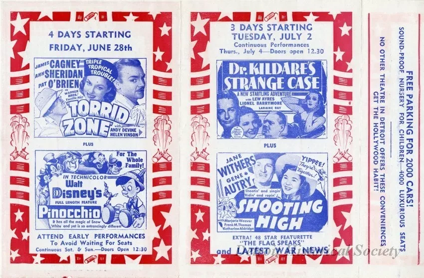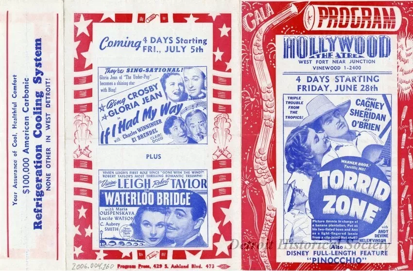 Three panel folded program brochure from the Hollywood Theatre containing advertisements for upcoming movies from the Hollywood Theatre beginning June 28, 1940; program is printed in black and white with red firework-themed decorative borders; "The Torrid Zone," and "Pinnochio" are featured on the cover; a flap on the side advertises the theater's "$100,000 American Carbonic refrigeration cooling system," sound-proof nursery, and free parking.