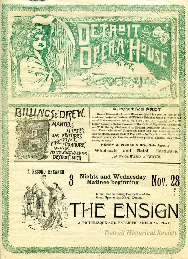 One Detroit Opera house program for a performance of the opera, "Robin Hood," by the Robin Hood Opera Company on November 24, 1892. The bi-fold program is printed in green and black ink on white paper. An upcoming play, "The Ensign," is advertised on the front. For the current play, a cast of characters and details are printed on the inside pages of the program at the center. The remaining program space is filled with small advertisements.