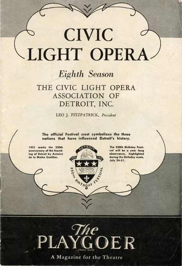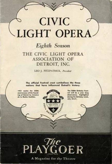 February 20, 1951 issue of The Playgoer serving as a program booklet for that week's performances of "Roberta" presented by the Civic Light Opera Association of Detroit at the Masonic Temple Auditorium as part of their eighth season. Detroit's 250th Birthday Festival crest is featured on the cover. Information on the production and advertisements are contained within.