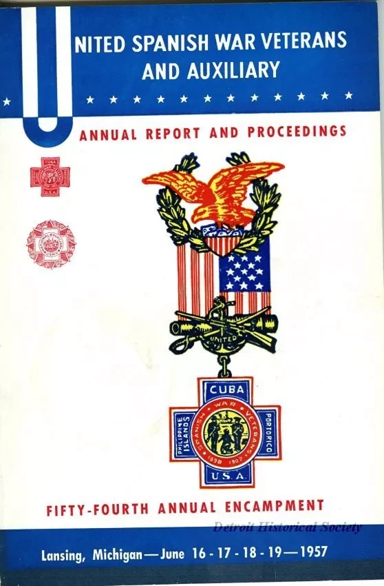 One program for the "United Spanish War Veterans and Auxiliary, Annual Report and Proceedings, Fifty-Fourth Annual Encampment." The encampment took place in Lansing, Michigan, on June 16-19, 1957. The program is printed in a softcover booklet format which contains 154 pages of printed text on white paper. The program shows the schedule of events, names of various committee members, and department reports. Black and white photographic images of various department officers and presidents are also shown. A photograph of the USWV Detroit Drum & Bugle Corps is shown on page 13.