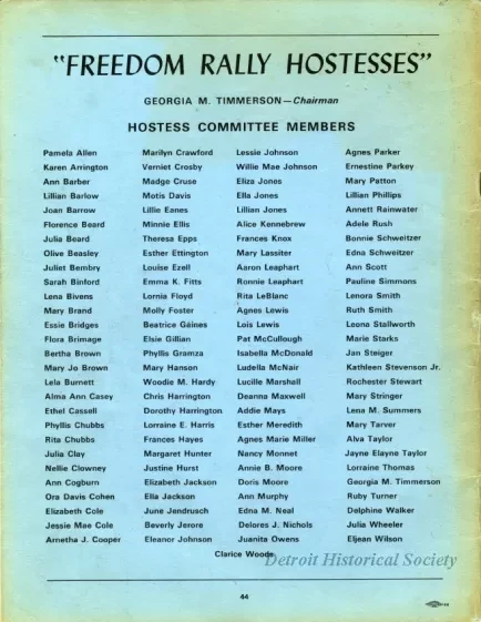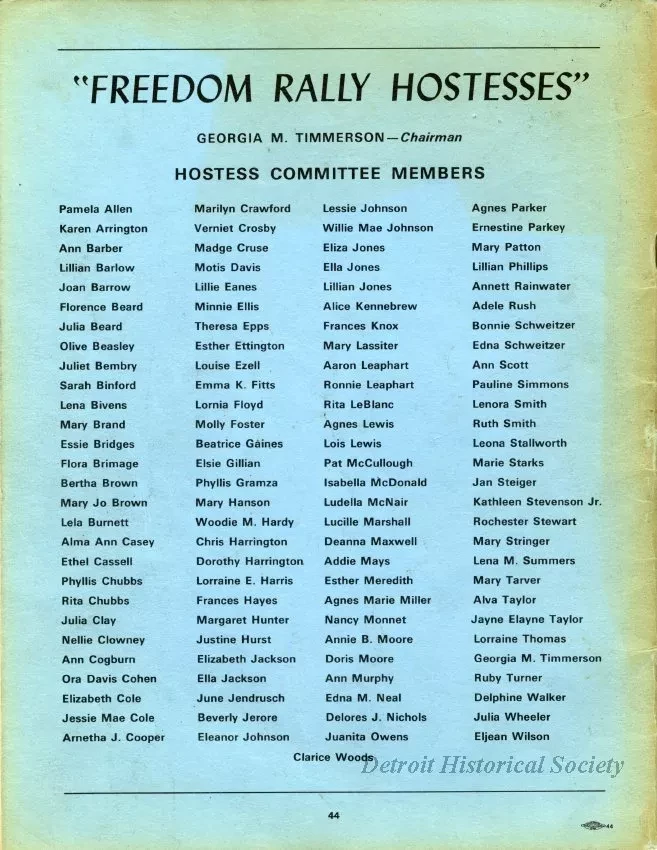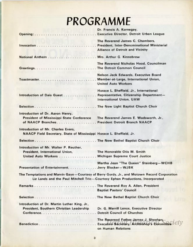 Program. "We Rally For Freedom, Cobo Hall, Detroit, June 19, 1966." This is a pale blue covered brochure with a drawing of one man carrying another. The men are walking down a path that is lined with a number of items including a helmet, a briefcase with the name James Meredith written on it, and a sign for Highway 51. Printed on the lower left side of the recto, "Courtesy of Christian Science Monitor Artist - Lepelley." Program is signed by Martin Luther King Jr., Walter Reuther, and Governor G. Mennen Williams. Verso of program lists the "Freedom Rally Hostesses."