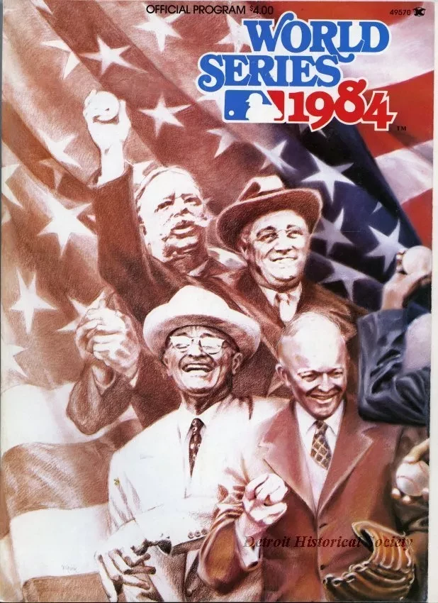 Official program for the 1984 World Series between the Detroit Tigers and San Diego Padres. Front cover features a fold-out reproduction of "First Pitch" by artist Sheila Wolk. It shows six different U.S. presidents throwing out a first pitch.