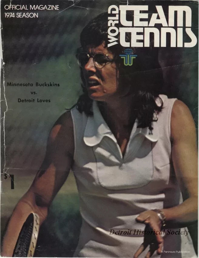 Program for a World Team Tennis match between the Detroit Loves and Minnesota Buckskins held at Cobo Arena on Aug 12, 1974. Billie Jean King is featured on the front cover.