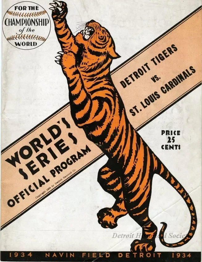Souvenir program for the 1934 World's Series between the Detroit Tigers and the St. Louis Cardinals, containing photos of league and team officials, team rosters, player profiles, score cards, a list of past World's Series champions, a brief history of the Detroit Tigers, an aerial photo of Navin Field, and numerous advertisements. An orange and black illustration of a tiger pawing at a baseball upon which "For the Championship of the World," is printed, comprises the cover. The price, 25¢, is printed near the center of the right edge.