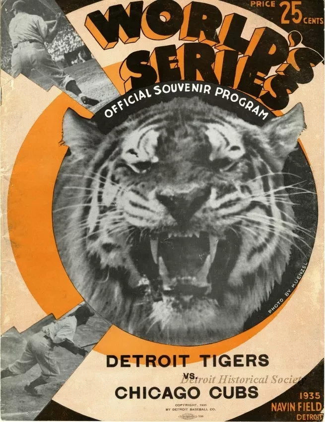 Souvenir program for the 1935 World's Series between the Detroit Tigers and the Chicago Cubs, containing photos of league and team officials, team rosters, player profiles, score cards, a list of past World's Series champions, a brief history of the Detroit Tigers, an aerial photo of Navin Field, and numerous advertisements. A black and white photo of a Tiger, credited to Kuenzel, surrounded by orange rings, and a pair of wedge-shaped photos of players, is printed on the cover, along with the price, 25¢.