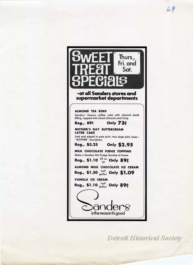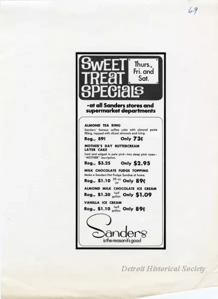 Sanders print advertisement proof for "Sweet Treat Specials" at Sanders locations. The specials, including a Mother's Day cake, are listed with prices and brief descriptions. The proof is printed on glossy paper.