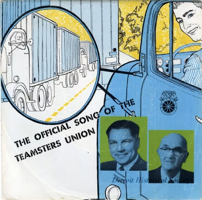 45 RPM Record. Contains "Song of the Teamsters Union" on side one, and the "Pledge of Allegiance" on side two. The record was released by Amron Records with copyright by Abe Olman Music, Inc., New York 19, N. Y. The record label is printed in blue text on a yellow background. The record is stored in a 7" x 7" white paper sleeve that is printed in blue, green, yellow, and black. The cover depicts a truck driver glancing to another trucker in his side view mirror, and contains monochromatic photo inserts of James R. Hoffa and John F. English. The words of the Song of the Teamsters Union are printed on the back.