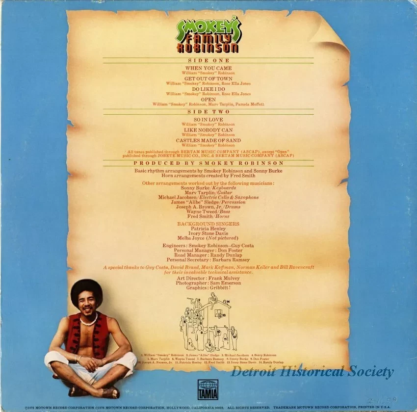 One record album entitled "Smokey's Family Robinson." The album consists of a cardboard jacket which has a color picture of Smokey Robinson and 13 other Motown performers who are seated or standing in and around a playhouse that is located in a tropical setting. The album verso shows the seven song titles that are produced on the record as well as the names of the performers and production staff. At the bottom edge, there is a copyright date of 1976 by Motown Record Corporation.