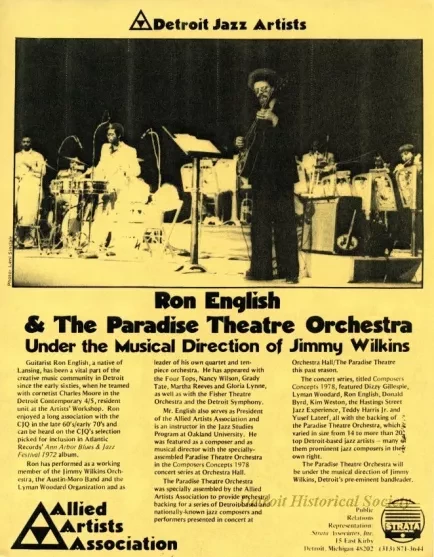 One news release advertising jazz guitarist, Ron English, and the Paradise Theatre Orchestra. The release is printed in black text on pale yellow paper and gives a brief biography of the guitarist and his work with the Paradise Theatre Orchestra at Orchestra Hall. The release was published by Strata Associates, Inc., for the Allied Artists Association.