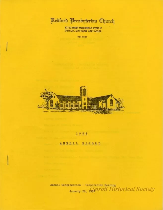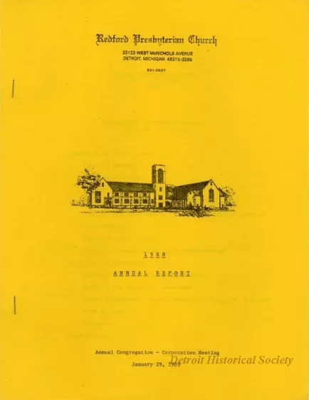 Click to enlarge 2009.090.005 Report, Annual 1988 annual report for Redford Presbyterian Church. Dated January 29, 1989. Date 1989 Collection Religion Extent of Description 8.5" x 11" 22 pages Search Terms Redford Avenue Presbyterian, Presbyterian, Churches Request Image