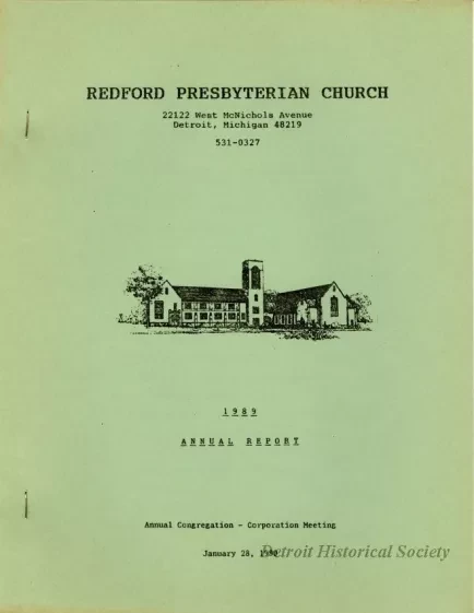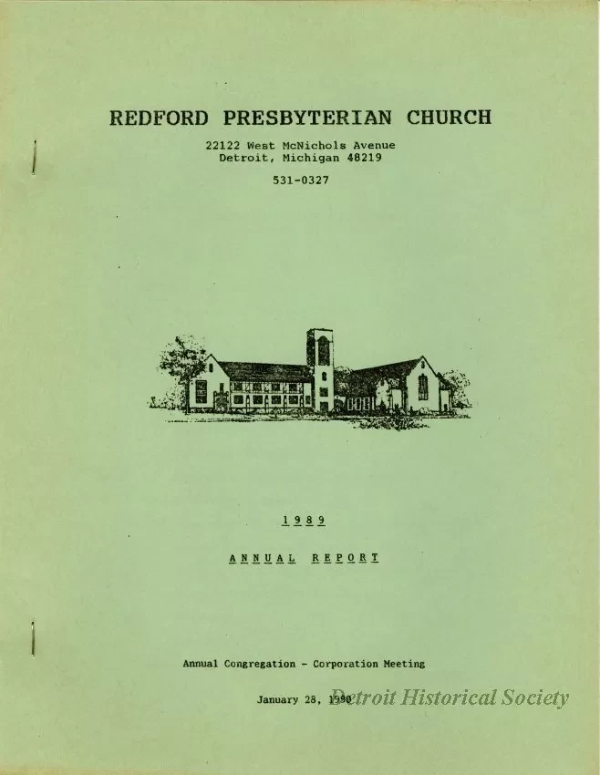 Click to enlarge 2009.090.006 Report, Annual 1989 annual report for Redford Presbyterian Church. Dated January 28, 1990. Date 1990 Collection Religion Extent of Description 8.5" x 11" 21 pages Search Terms Redford Avenue Presbyterian, Presbyterian, Churches Request Image