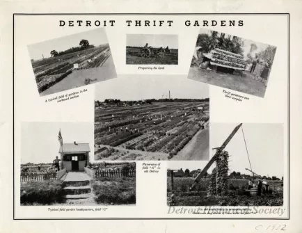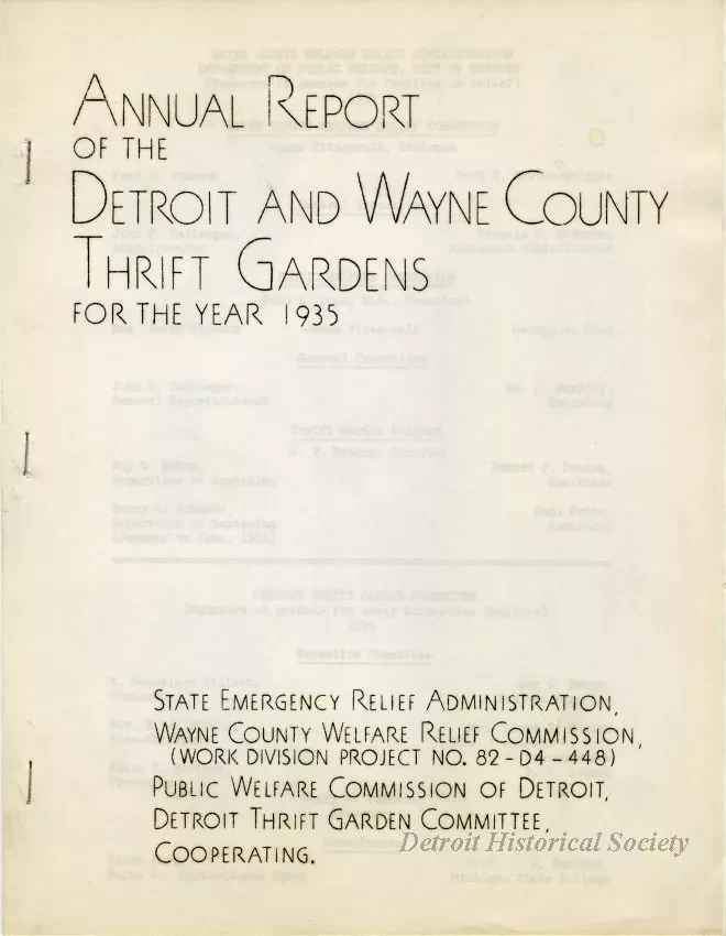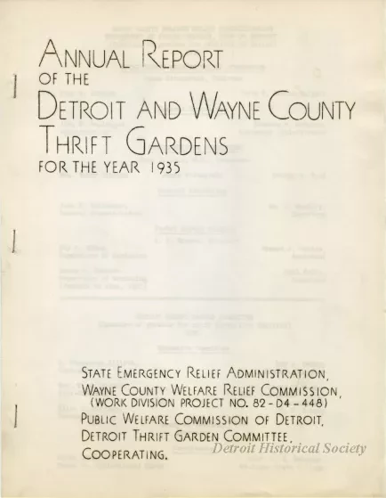 Annual report compiled through the cooperation of the State Emergency Relief Administration, Wayne County Welfare Relief Commission, Public Welfare Commission of Detroit, and Detroit Thrift Garden Committee, consisting of 13 stapled pages plus a large fold-out containing instructions and a planting schedule. Also contained within the packet are a list of committee members, a page of photos of some of the gardens, information about supplies and expectations for gardeners, information about the 21 fields including a map, budget, and the successes and shortcomings of the project.