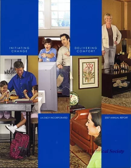 One annual report of La-Z-Boy, Inc., of Monroe, Michigan, for 2007. The cover has four alternating vertical panels with white text on a blue background along with four color photographic images of consumers who are using various La-Z-Boy furniture products. The report contains 78 pages of printed text that give financial details and other information about the company business for the fiscal year. Color photographic images are included with the text.
