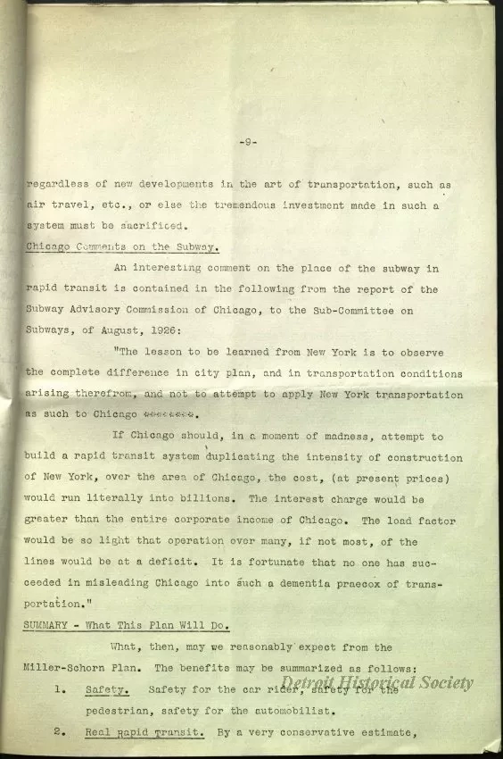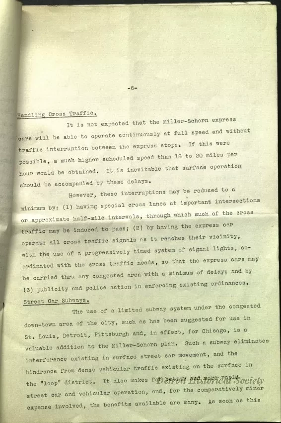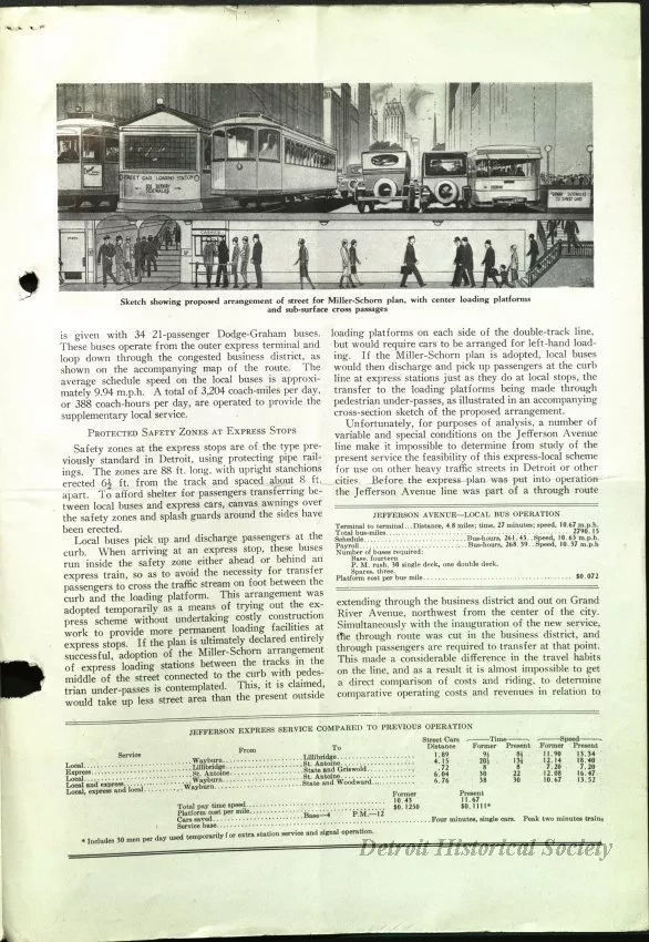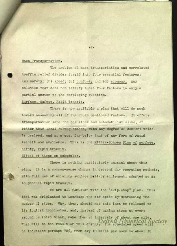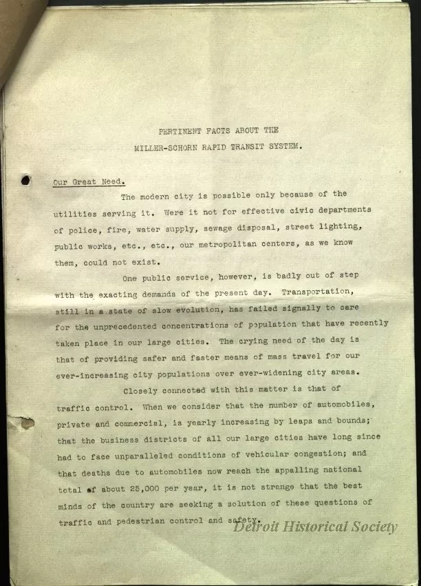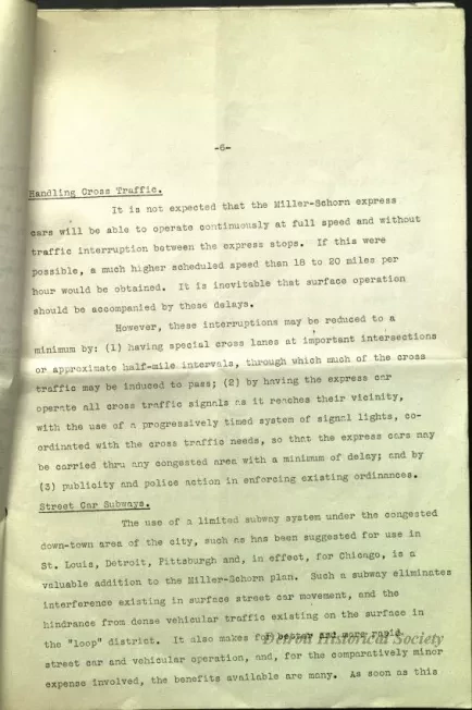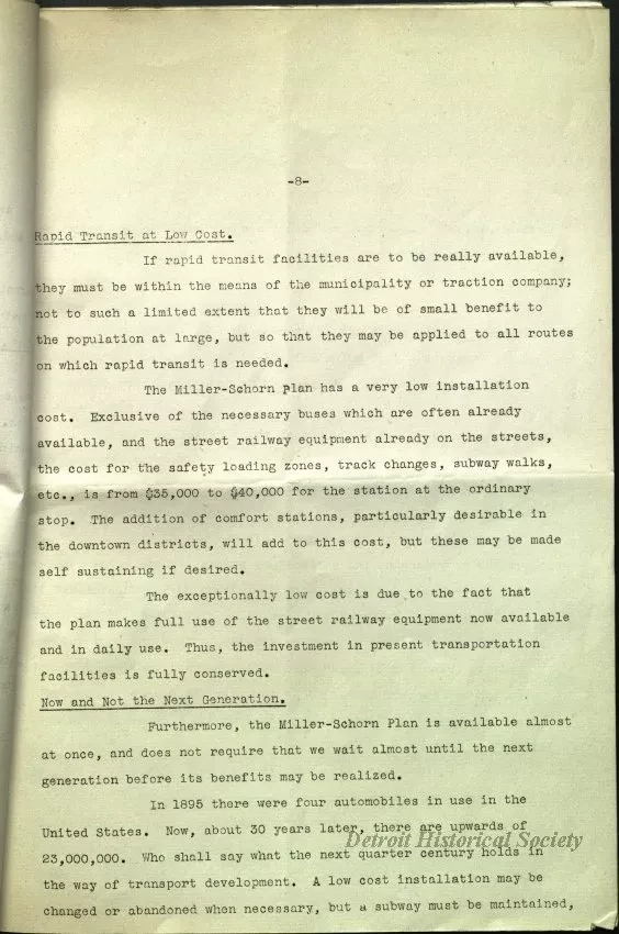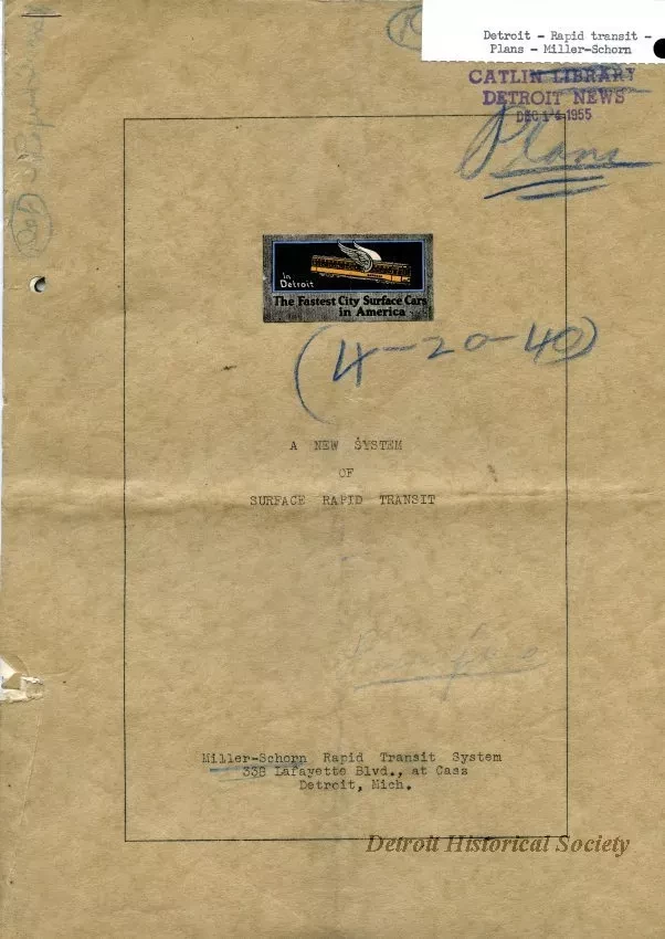One report entitled "A New System of Surface Rapid Transit." The softcover report has a tan cover and contains 12 typewritten pages that discuss the "Miller-Schorn Rapid Transit System." Included at the back of the report is a reprint of a 4-page article from the "Electric Railway Journal" of January, 1928, which discusses rapid transit in Detroit and gives details and conceptual drawings of the proposed Miller-Schorn plan.