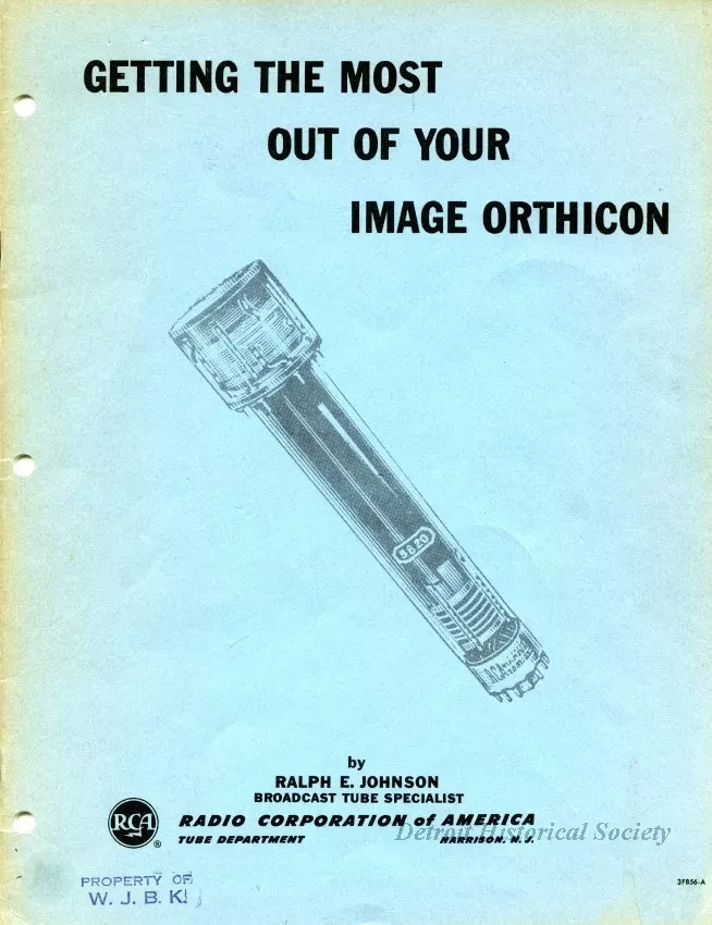 One technical report entitled "Getting the Most Out of Your Image Orthicon" that was published based upon a talk given by Ralph E. Johnson of the Radio Corporation of America. The softcover, booklet-style report has a heavyweight light blue paper cover with black title text and a gray image of the Image Orthicon vacuum tube shown on the front. The report contains 19 pages of black printed text on white paper that discusses the image orthicon operation including temperature considerations, alignment, focus, and other adjustments. Graphs are included with the text along with black and white photographic images.