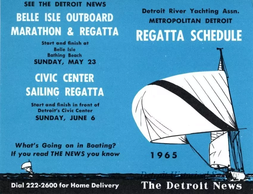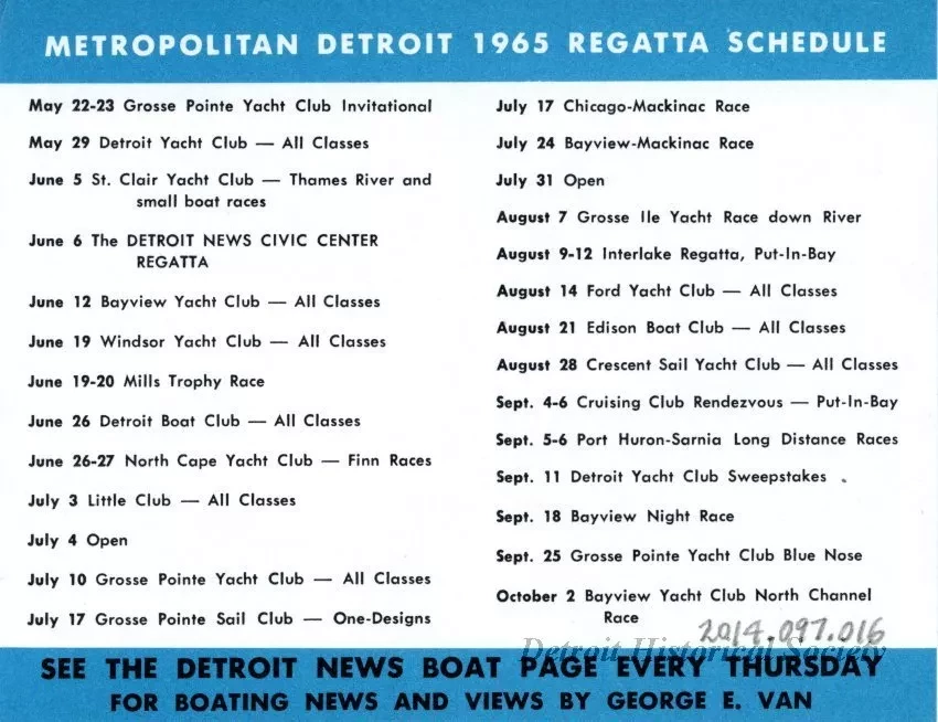 One pocket schedule entitled "Detroit River Yachting Assn. Metropolitan Detroit Regatta Schedule." The schedule, a bi-fold card, is printed in black and white text on a contrasting white and blue background and shows the listings for sailboat races that were sponsored by local yacht clubs in the Detroit area from May through October, 1965. The card was printed by the Detroit News and encouraged readers to "See the Detroit News Boat Page Every Thursday" and to look "For Boating News and Views by George E. Van."