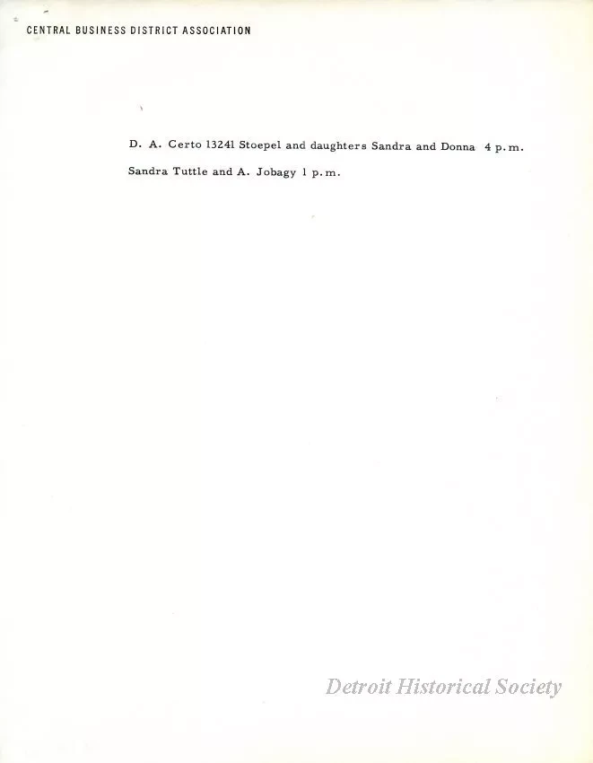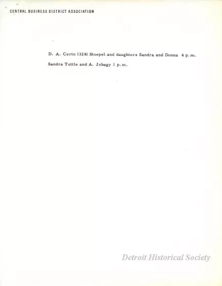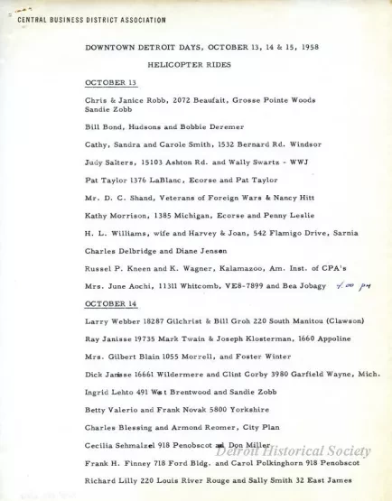 One schedule entitled "Downtown Detroit Days, October 13, 14, & 15, 1958, Helicopter Rides," that was prepared by the Central Business District Association. The 2-page schedule is typewritten in black text on white paper and lists the names of people who had won a helicopter ride as part of the Downtown Detroit Days shopping event.