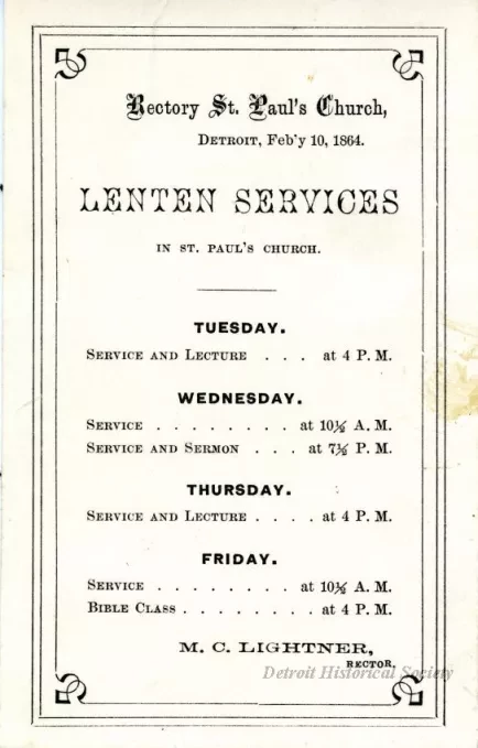 One schedule card entitled "Lenten Services in St. Paul's [Episcopal] Church, Detroit." The card is printed in black ink on heavy white paper and shows the church service schedule for Tuesday through Friday during Lent. The card is dated "Feb'y 10, 1864" and indicates that "M. C. Lightner" was the Rector.