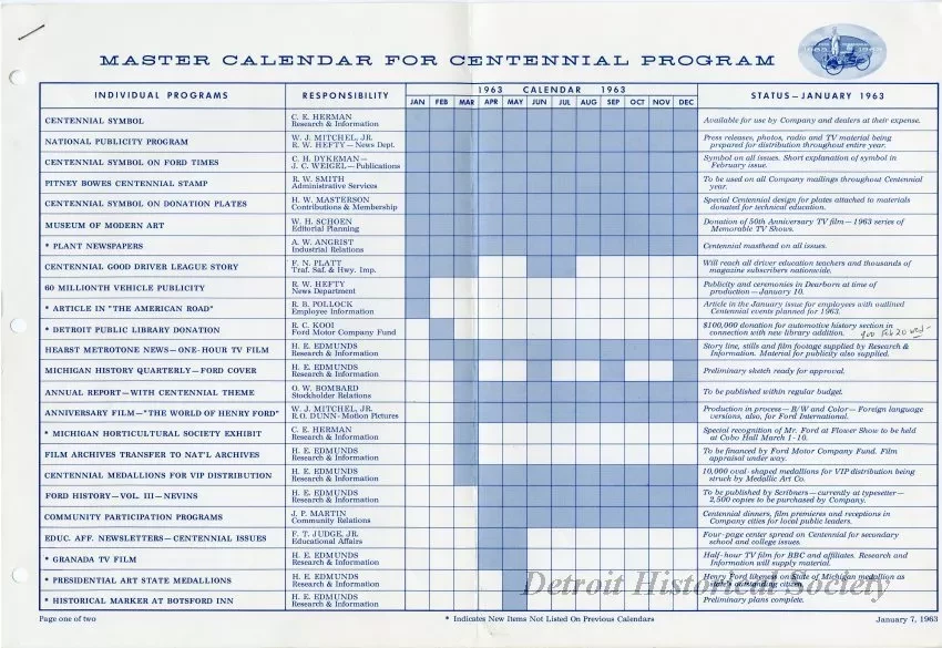 Schedule of 48 events planned as part of the Henry Ford Centennial, listed by month across two stapled pages, both punched with holes to be bound in a three-ring binder. In addition to the table of which months the events are scheduled, additional columns record who is in charge of each event, and the event's status as of January 1963. A handwritten note has been made in the status cell for the $100,000 Detroit Public Library automotive history section donation, "900 Feb. 20 Wed." The schedule is dated January 7, 1963.