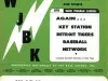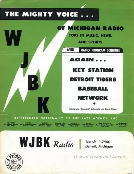One radio program schedule, dated April, 1955, for WJBK Radio in Detroit. The bi-fold program is printed in green and black text on white paper. The front page advertises "Music, News, and Sports," and notes that it is a "Key Station, Detroit Tigers Baseball Network." The interior pages list the daily program schedule from 6:00 A.M. to 5:55 A.M. The back page shows small head and shoulders, black and white images of popular station personalities along with a schedule of Detroit Tigers baseball games radio broadcasts.