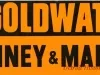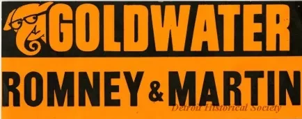 Bumper sticker for the Republican Party candidates for President of the United States and Governor of Michigan for 1964. Top half reads "GOLDWATER" in orange text on a black background, with an illustration of an elephant to the left. Bottom half reads "ROMNEY & MARTIN" in black text on an orange background.