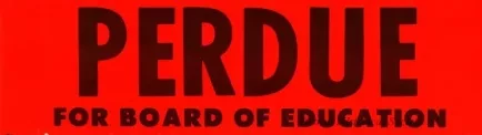 One bumper sticker from the political campaign to elect "[Andrew] Perdue for Board of Education." The bumper sticker is made of white vinyl that shows black text on a red/orange background. The bumper sticker has a peel-away tan paper backing. Small gray printed text on the backing shows the manufacturer's logo and text that reads "Removable Strip-Tac," and "The Brown Bridge Mills, Troy, Ohio."
