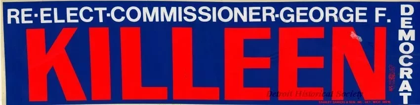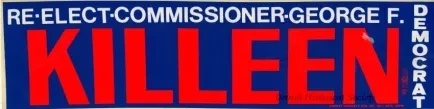 One bumper sticker from the political campaign to "Re-Elect Commissioner George F. Killeen, Democrat." The bumper sticker is made of white vinyl that shows white and red text on a dark blue background. Small red printed text along the lower right edge reads " ." The sticker has a peel-away paper backing.