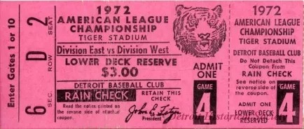 Request ImageTicket to game 4 of the American League Championship Series between the Detroit Tigers and Oakland Athletics at Tiger Stadium. Lower deck reserve, $3.00