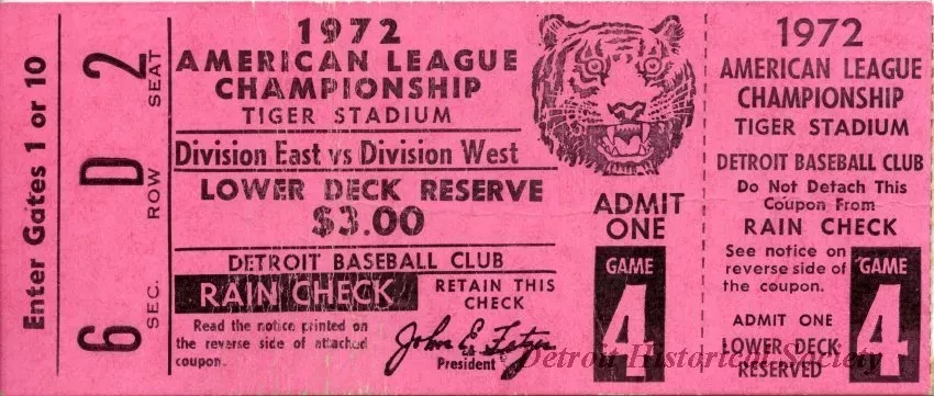 Ticket to game 4 of the American League Championship Series between the Detroit Tigers and Oakland Athletics at Tiger Stadium. Lower deck reserve, $3.00