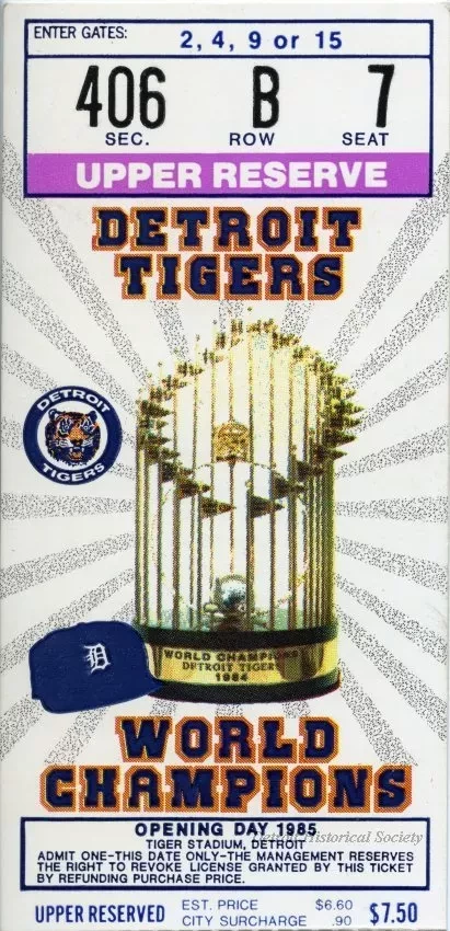 Ticket for the Detroit Tigers opening day game against the Cleveland Indians, played Apr. 8, 1985 at Tiger Stadium. Upper Reserve, $7.50.